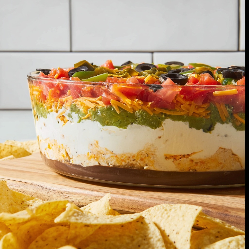 This classic 7 Layer Dip is a vibrant, flavorful appetizer perfect for parties and gatherings. Layers of seasoned refried beans, creamy guacamole, sour cream, shredded cheddar cheese, fresh tomatoes, black olives, and green onions come together to create a delicious, crowd-pleasing dip that’s easy to prepare and sure to impress.
