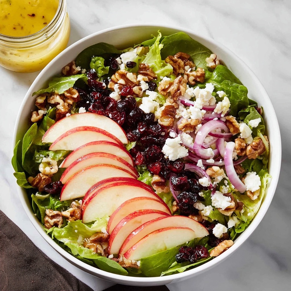 Gently toss the apple slices, salad leaves, onions, and cranberries with the dressing until everything is lightly coated. Add the candied walnuts last to preserve their crunch. If you like, sprinkle some crumbled feta or goat cheese on top for a creamy, tangy garnish. Serve immediately and enjoy the beautiful balance of flavors and textures in your Apple Salad with Candied Walnuts and Cranberries Recipe.