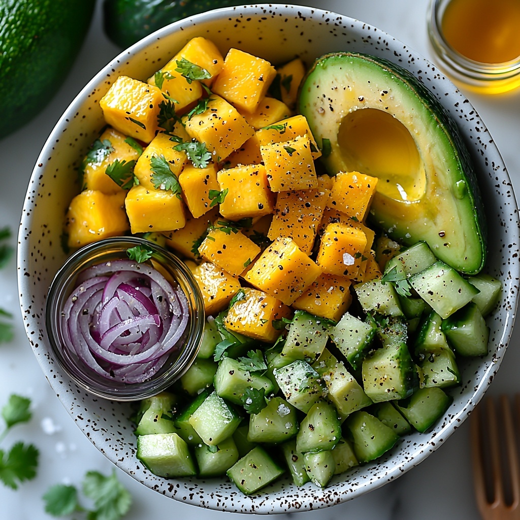 A refreshing and vibrant Avocado Mango Salad featuring ripe avocados and mangoes combined with crisp cucumber, red onion, and fresh cilantro, dressed in a light lime and olive oil dressing. Perfect as a light lunch or a side dish, this no-cook salad is easy to prepare and bursting with tropical flavors.