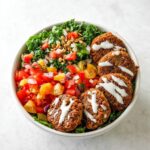 This Baked Falafel recipe offers a healthier twist on the classic Middle Eastern favorite, using a blend of chickpeas, fresh herbs, sun-dried tomatoes, and spices. Instead of frying, the falafel are baked to golden perfection, serving as a flavorful and nutritious vegetarian dish paired with a vibrant bulgur and greens salad and creamy tahini dressing.