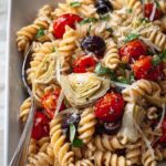 This Baked Mediterranean Pasta is a flavorful and comforting dish featuring al dente rotini tossed with sautéed onions, garlic, cherry tomatoes, artichoke hearts, and kalamata olives. Topped with mozzarella cheese and baked until bubbly and golden, it’s a perfect family meal with vibrant Mediterranean flavors.