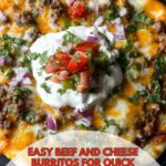 These Beef and Cheese Burritos are hearty and flavorful, combining seasoned ground beef with a blend of cheddar and mozzarella cheeses, all wrapped in warm flour tortillas. Finished with sour cream, salsa, and fresh cilantro, they make a perfect quick and satisfying meal.