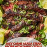 This Best Carne Asada Steak Recipe features marinated skirt steak cooked to perfection in a cast iron skillet for a deliciously charred, flavorful Mexican-style grilled steak. The skirt steak is marinated in a tangy blend of lime juice, orange juice, soy sauce, brown sugar, garlic, and spices, then pan-seared to juicy, tender perfection. Served with fresh lime, avocado, onion, queso fresco, salsa, cilantro, and warm tortillas, this carne asada is perfect for tacos or a hearty meal.