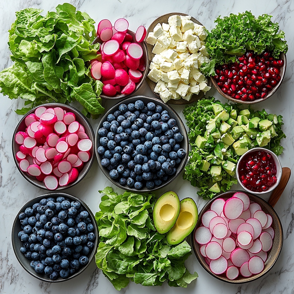 - Add toppings: Evenly distribute candied pistachios, thinly sliced red onion, watermelon radish, sliced avocados, fresh blueberries, pomegranate arils, and crumbled feta cheese over the greens, layering the salad to showcase its vibrant colors and variety of textures.