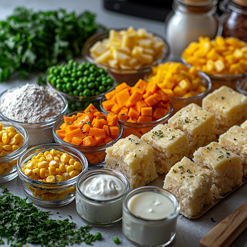 The magic of this Cheddar Bay Biscuit Seafood Pot Pie Recipe lies in its simple but essential ingredients. Each one plays a crucial role: the fresh seafood for a tender bite, veggies adding brightness and texture, and those cheesy biscuits offering a buttery, garlicky top that perfectly balances the creamy filling.