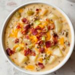 This hearty Cheeseburger Soup combines crispy bacon, ground beef, tender potatoes, and sharp cheddar cheese in a creamy, flavorful broth. It’s an easy-to-make comfort food perfect for chilly days, bringing all the cozy flavors of a cheeseburger into a warm, satisfying soup bowl.