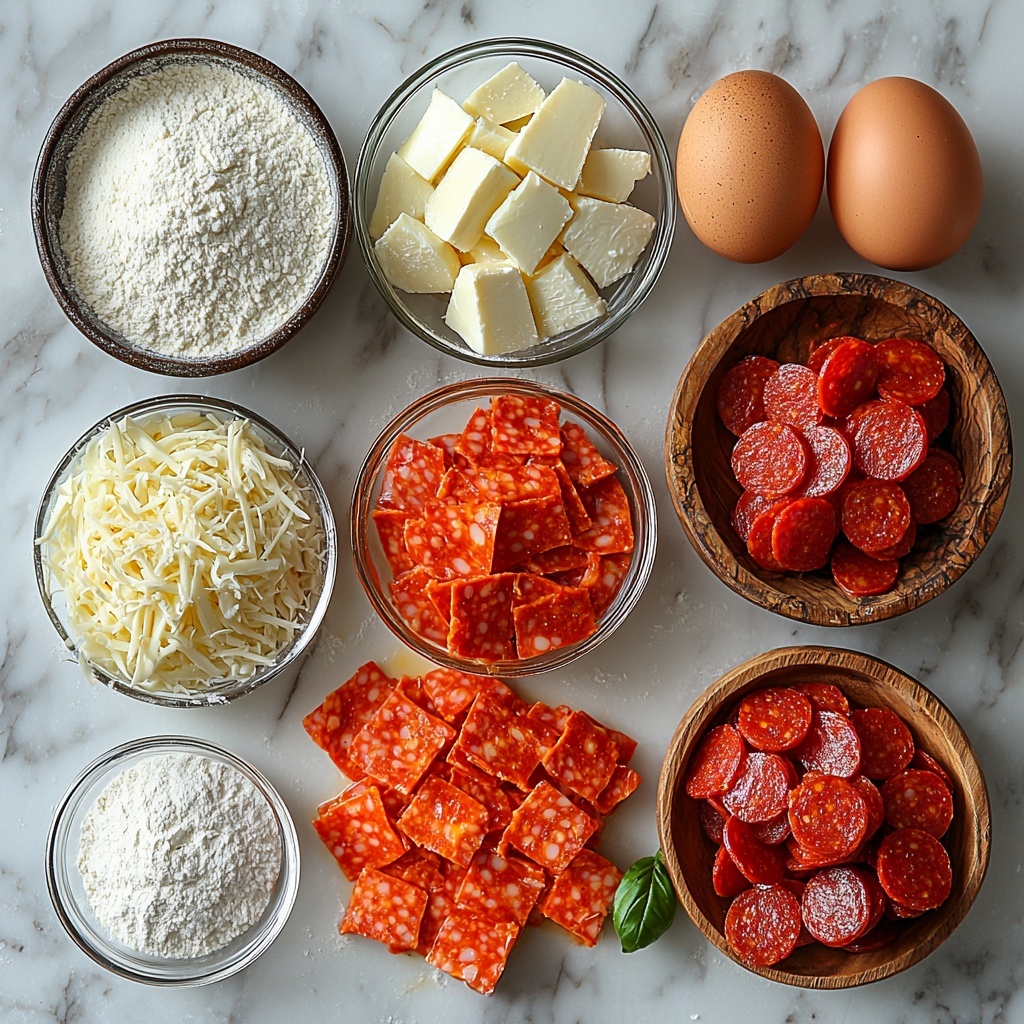 This recipe leans on a handful of simple, pantry-friendly ingredients, each chosen to enhance flavor, texture, and freshness. From the soft flour base to the zing of fresh basil, every item plays its part to make these Cheesy Pepperoni Bites with Vegetarian Option Recipe truly shine.