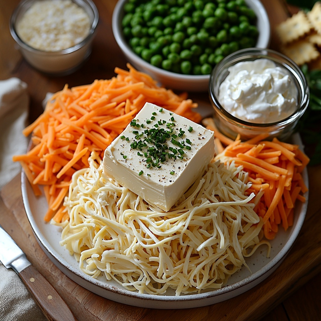 - Add Chicken and Vegetables: Fold in the cooked chicken, frozen peas and carrots, and half of the shredded cheddar cheese, ensuring everything is well incorporated.