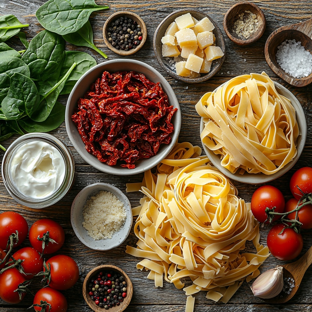 Simple and essential, these ingredients come together to create layers of flavor, rich texture, and a pop of color that makes this pasta dish truly irresistible. Each element plays its part, from the earthy olive oil to the bright sun-dried tomatoes and creamy dairy mix.