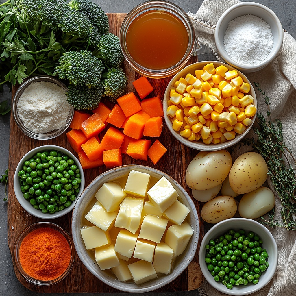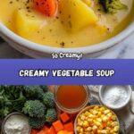 A rich and creamy vegetable soup packed with carrots, potatoes, broccoli, corn, and peas, simmered in a flavorful vegetable broth and finished with cream or milk for a comforting, satisfying meal perfect for any season.