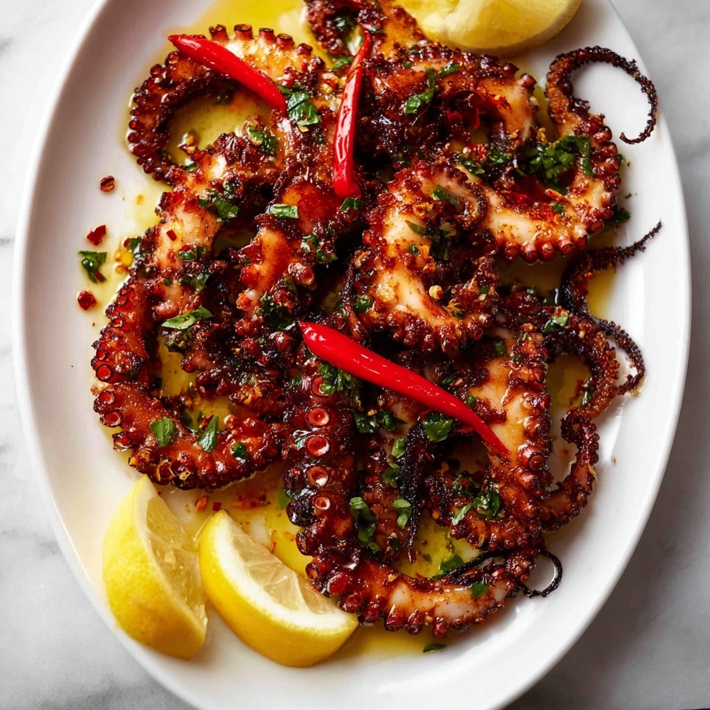 Transfer the crispy marinated baby octopus to a platter, sprinkle with fresh parsley and sliced red chili for an eye-catching finish, and don’t forget a generous heap of lemon wedges. This final touch injects brightness right at the table and invites everyone to customize their bite. Serve immediately and get ready to wow your guests.