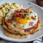 This Irresistible Egg Topped Hash Browns with Bacon Gravy Delight is a hearty and comforting breakfast recipe featuring crispy shredded potatoes topped with soft-cooked eggs and a rich, savory bacon gravy, garnished with fresh herbs. Perfect for a satisfying meal that combines textures and flavors seamlessly.