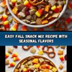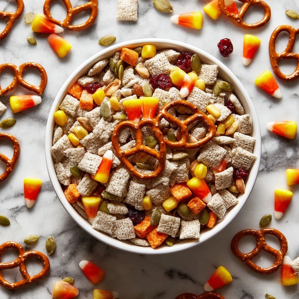 This Fall Snack Mix is a delightful combination of sweet, salty, and crunchy treats perfect for autumn snacking. Featuring mini pretzels, roasted peanuts, candy corn, honey-roasted cereal squares, dried cranberries, yogurt-covered raisins, cheddar cheese crackers, and pumpkin seeds, all coated in a warm cinnamon and nutmeg butter glaze and baked for a flavorful, irresistible mix.