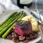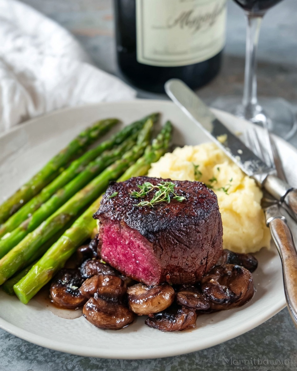 This dish pairs beautifully with creamy mashed potatoes, which soak up the mushroom wine sauce effortlessly. Roasted asparagus or garlic green beans add color, crunch, and a touch of brightness—perfect for balancing the richness of the filet mignon. Or consider buttery roasted fingerling potatoes for a rustic, comforting combination.
