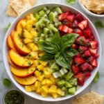 A refreshing and vibrant fruit salsa paired with crispy cinnamon chips made from baked tortillas. This easy-to-make recipe combines diced peaches, mango, kiwis, and strawberries with a honey-lemon dressing and fresh basil for a sweet and tangy treat, complemented perfectly by warm, cinnamon-spiced tortilla chips.