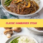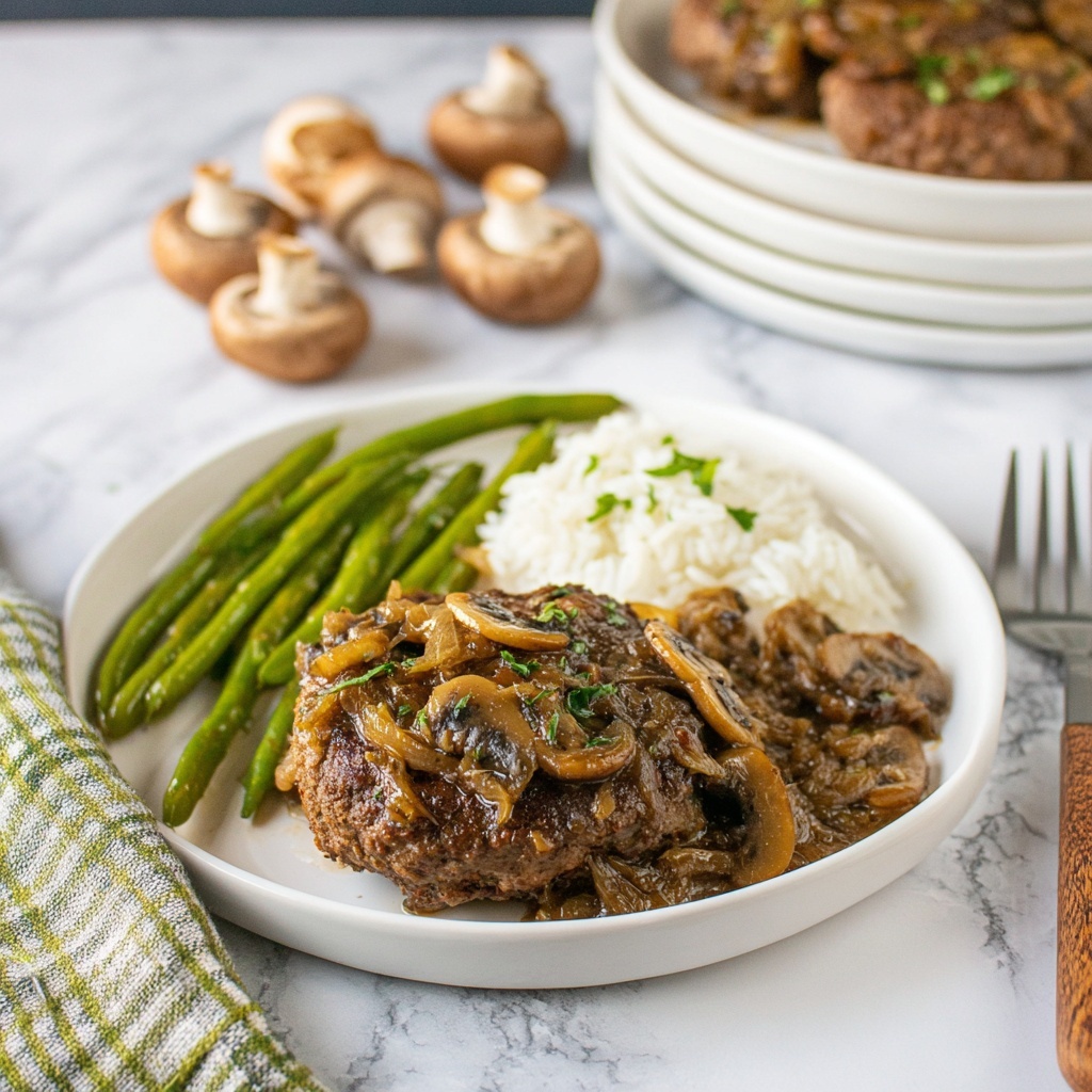 This Hamburger Steak with Mushrooms and Onion Gravy Recipe pairs beautifully with creamy mashed potatoes or fluffy buttered egg noodles, both of which soak up the gravy like little flavor sponges. Steamed green beans or roasted carrots add a pop of color and a fresh, crisp contrast to balance the rich, meaty sauce.