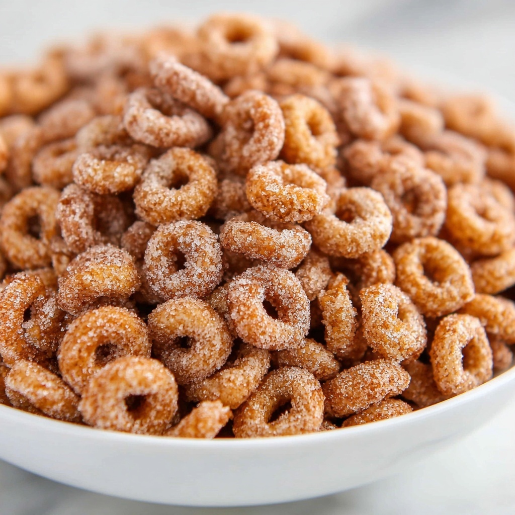 Remove the skillet from heat and sprinkle the cinnamon sugar mixture over the hot buttery Cheerios. Immediately stir it well so the sugar crystals melt slightly and the spice envelops every crunchy bite. This coating locks in the flavor and gives the snack a beautiful, sweet-spiced finish.