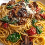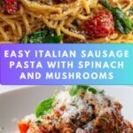 A hearty and flavorful Italian Sausage Pasta featuring savory Italian sausage, sautéed mushrooms, fresh spinach, and a rich marinara sauce, all tossed with your favorite pasta. This one-pan stovetop recipe is perfect for a satisfying weeknight dinner and can be customized with a touch of heat from red pepper flakes and garnished with Parmesan and fresh herbs.
