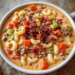 This rich and hearty Macaroni Cheeseburger Soup combines the comforting flavors of a classic cheeseburger with creamy macaroni pasta. Ground beef and crispy bacon form a savory base, enhanced with sautéed vegetables, spices, and a luscious cheese sauce made from sharp cheddar and mozzarella. The soup is thick, creamy, and full of classic burger toppings like diced pickles and green onions, making it a satisfying one-pot meal for any occasion.