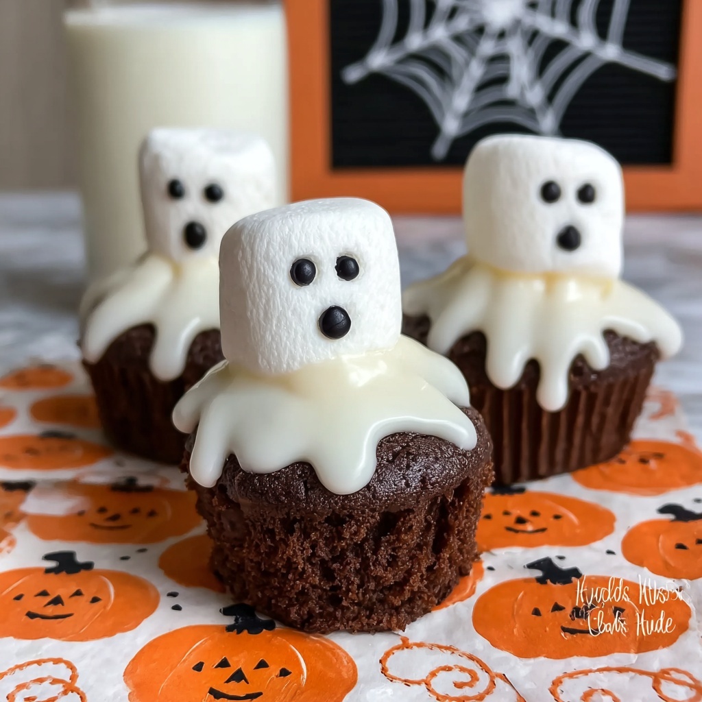 These Marshmallow Ghost Cupcakes are a fun and spooky treat perfect for Halloween or any ghostly celebration. Moist chocolate cupcakes are topped with large marshmallows, covered in melted vanilla frosting to create a smooth ghostly appearance, and finished with black icing eyes and mouths for a playful effect.