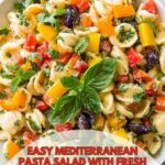 A vibrant and refreshing Mediterranean Pasta Salad featuring orecchiette pasta, colorful bell peppers, juicy tomatoes, tangy feta cheese, and briny kalamata olives, tossed in a zesty lemon and olive oil dressing. Perfect as a light lunch or a side dish for summer gatherings.