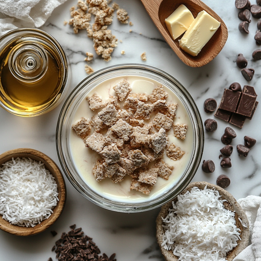 - Add Dry Ingredients: Stir in the graham cracker crumbs, dried coconut, and chocolate chips until the mixture is well mixed and uniform.