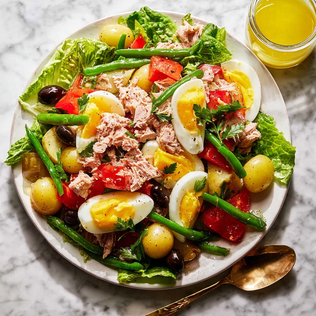 In a large bowl or serving platter, combine the sliced potatoes, blanched green beans, tomato wedges, torn baby cos lettuce, quartered hard-boiled eggs, and black olives. Gently fold in the drained tuna in chunks. Drizzle the prepared dressing over everything and toss lightly to combine without breaking up the delicate components.