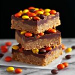 Spread the chocolate-peanut butter mixture evenly over the peanut butter layer. Then sprinkle the entire top generously with Reese’s Pieces. These colorful candies not only taste amazing but also give the bars a festive and textured finish.