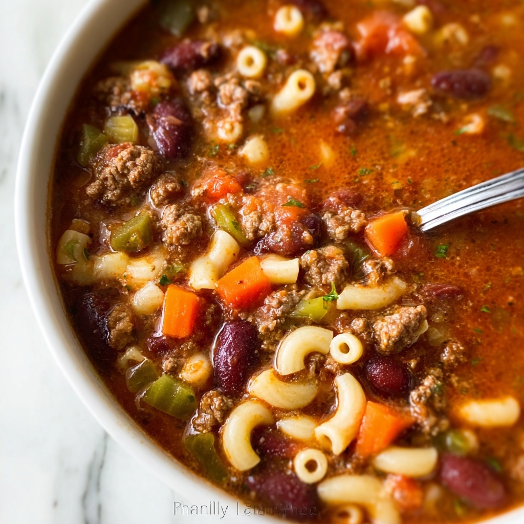 A hearty and comforting Olive Garden-style Pasta e Fagioli soup featuring lean ground beef, mixed beans, vegetables, and ditalini pasta simmered in a flavorful tomato and chicken broth base. This classic Italian-American soup is perfect for a satisfying family meal.