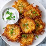 Crispy and golden Potato Latkes made from shredded russet potatoes and onions, perfectly seasoned and fried to perfection. These traditional Jewish pancakes are a delicious treat, ideal for festive occasions or a comforting snack served warm with sour cream and chives.