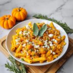 A comforting and creamy pumpkin pasta featuring roasted pumpkin cubes simmered in a flavorful sauce of garlic, thyme, vegetable stock, and cream, finished with crumbled feta and parmesan cheeses for a rich and savory dish. Perfect for autumn meals, this recipe balances smooth creaminess with hearty textures and a hint of fresh herbs.