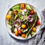- Assemble Salad: In a large salad bowl, combine baby spinach, halved cherry tomatoes, thinly sliced red onion, cooked quinoa, and asparagus pieces. Pour the dressing over the salad and toss gently to coat everything evenly.