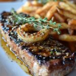 Presentation can turn a meal into an experience, so consider plating your Ribeye Steak with Caramelized Onions and Crispy French Fries Recipe on a rustic wooden board for a cozy, steakhouse vibe. Alternatively, stack the onions on the steak neatly and arrange fries in a small metal basket or ramekin for a fun, bistro-style look that’s sure to impress your guests.