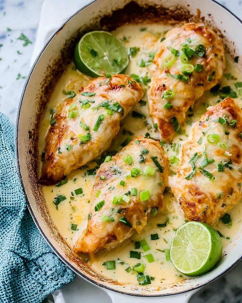 - Garnish and Serve: Carefully remove the skillet from the oven. Garnish the chicken with fresh chopped cilantro, lime slices, and optional thinly sliced scallions. Serve warm and enjoy the vibrant, cheesy salsa verde chicken.