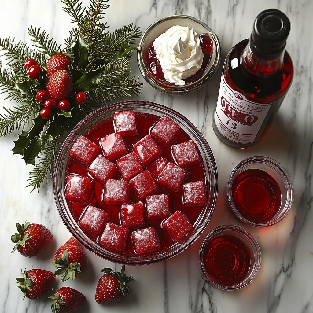 Gathering your ingredients is a breeze, and each one plays a crucial role in creating the iconic taste, texture, and festive look of this recipe. From the sweet and vibrant strawberry gelatin to the chilled vodka for that spirited kick, every component is essential for turning simple ingredients into a holiday party favorite.