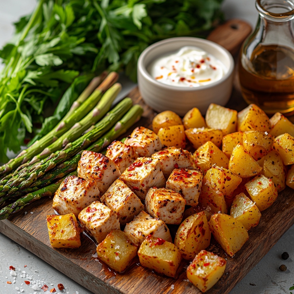 A flavorful Greek-inspired dish featuring chili-spiced chicken bites served with roasted golden potatoes, crispy Parmesan asparagus, and a rich smoked feta cream sauce. This savory chicken Alfredo brings bold Mediterranean flavors to your dinner table with a perfect blend of spice, creamy texture, and fresh herbs.