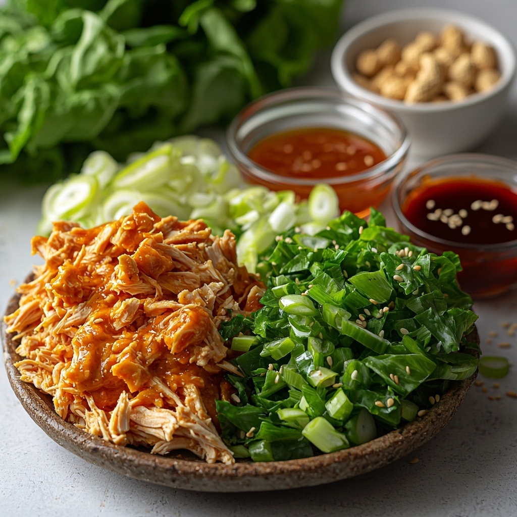 - Assemble wraps: Separate the lettuce leaves carefully, rinse and pat dry. Spoon the chicken mixture into each lettuce leaf to make individual wraps. Garnish the top with chopped roasted peanuts and thinly sliced green onions for added crunch and freshness. Serve immediately.