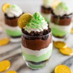 - Finish and Garnish: Top each parfait with a large dollop of the green whipped pudding. Decorate with chocolate gold coins and more Oreo crumbs as desired.