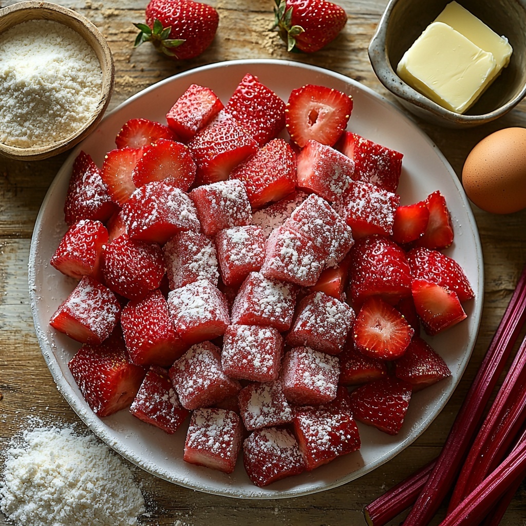 The magic behind these bars lies in a handful of simple but essential ingredients that work in harmony. Each ingredient contributes something special, from the tangy pop of fresh rhubarb and strawberries to the buttery, sugar-kissed crust and topping that create a perfect texture balance.