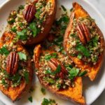 For a festive touch, serve the stuffed sweet potatoes on a rustic wooden board or bright ceramic plate that highlights the vivid colors. You could also turn this recipe into a build-your-own dinner party where everyone stuffs their own sweet potato with different toppings, from spicy salsas to crunchy nuts.