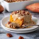 This Sweet Potato Cake is a moist, spiced dessert perfect for any occasion. Made with mashed sweet potatoes, warm spices, and a rich cinnamon brown sugar topping, this cake is topped with a creamy maple glaze and optional pecans for added texture and flavor. It combines the natural sweetness of sweet potatoes with comforting fall flavors for a delicious treat.