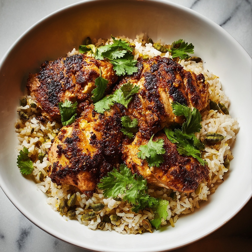 - Serve: Plate the cardamom-spiced rice and top with the sliced vadouvan chicken. Garnish with chopped fresh cilantro for a bright finish.