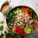 To impress your guests, serve this Vietnamese Chicken Salad Recipe in individual lettuce cups or on a beautiful platter layered with colorful edible flowers and extra herbs. You can also stack the salad in a tall clear glass for a layered effect, showcasing all the vibrant colors before mixing it up at the table.