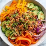 This Viral Cucumber Pepper Salad is a refreshing and crunchy dish featuring Persian cucumbers, mini sweet bell peppers, and vibrant carrots tossed in a flavorful Asian miso ginger dressing. Enhanced with chili crunch oil and everything bagel seasoning, this salad delivers a perfect balance of sweet, spicy, and savory flavors, making it an ideal cold side or light snack.