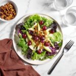 Pour the dressing over the combined fruits and nuts, then toss gently until everything is well coated. This step brings all the flavors together in harmony. Once tossed, plate the salad over a bed of fresh mixed greens and garnish with a few extra candied walnuts for that final burst of sweetness and crunch.