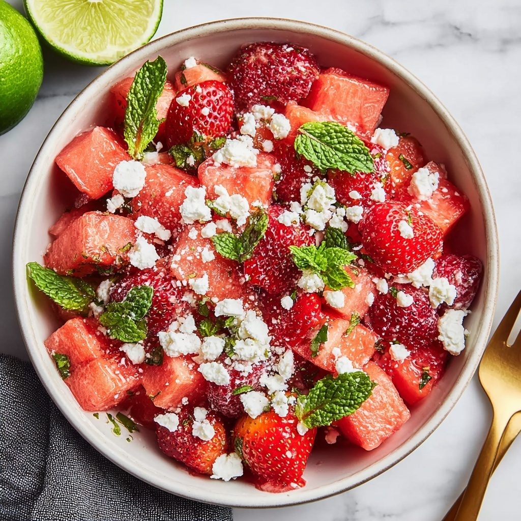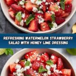 A refreshing and vibrant watermelon salad combined with juicy strawberries, crumbled feta cheese, and fresh mint, all brought together with a tangy honey lime dressing. Perfect for a light summer dish or a healthy side.