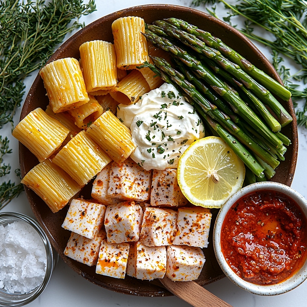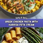 This Zesty Greek Chicken Pasta features tender marinated chicken breasts served over rigatoni tossed in a spicy harissa feta cream sauce. Roasted asparagus crisps add a delightful crunch, while fresh herbs provide a burst of flavor. This vibrant dish combines Mediterranean ingredients with creamy, spicy notes for a satisfying weeknight dinner.